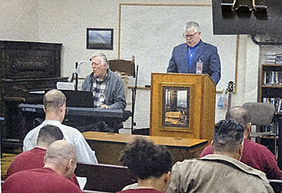 Warren Johnson prays over Super Bowl Sunday offering, top, and volunteers at Olympic Corrections Center, bottom. |